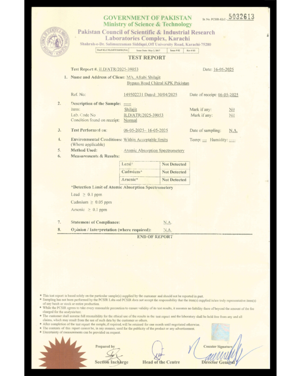Each batch is certified to contain genuine Aftabi Shilajit, sourced from high-altitude mountain rocks of Chitral and Gilgit Baltistan.